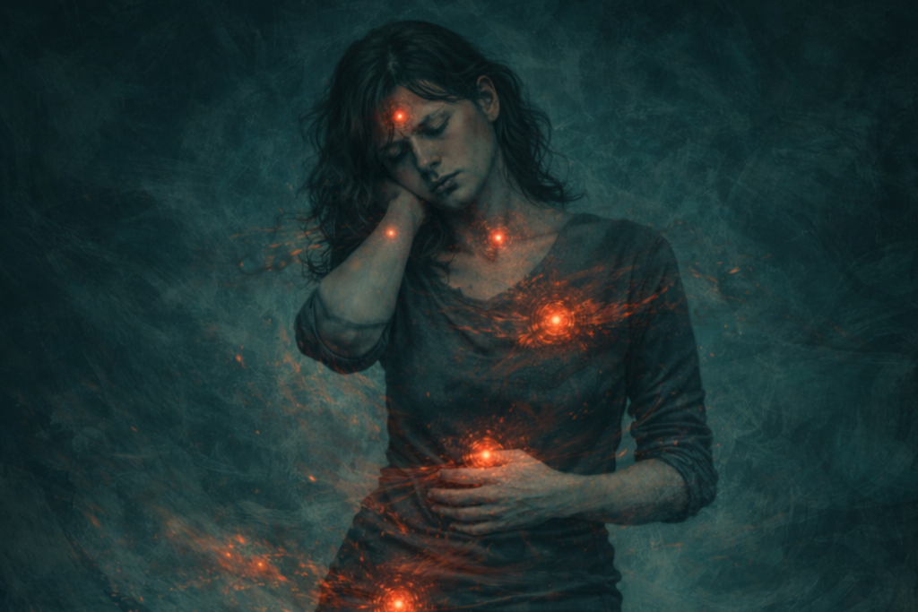 Enge. Druck. Müdigkeit. Nacken, Bauch, Brust.